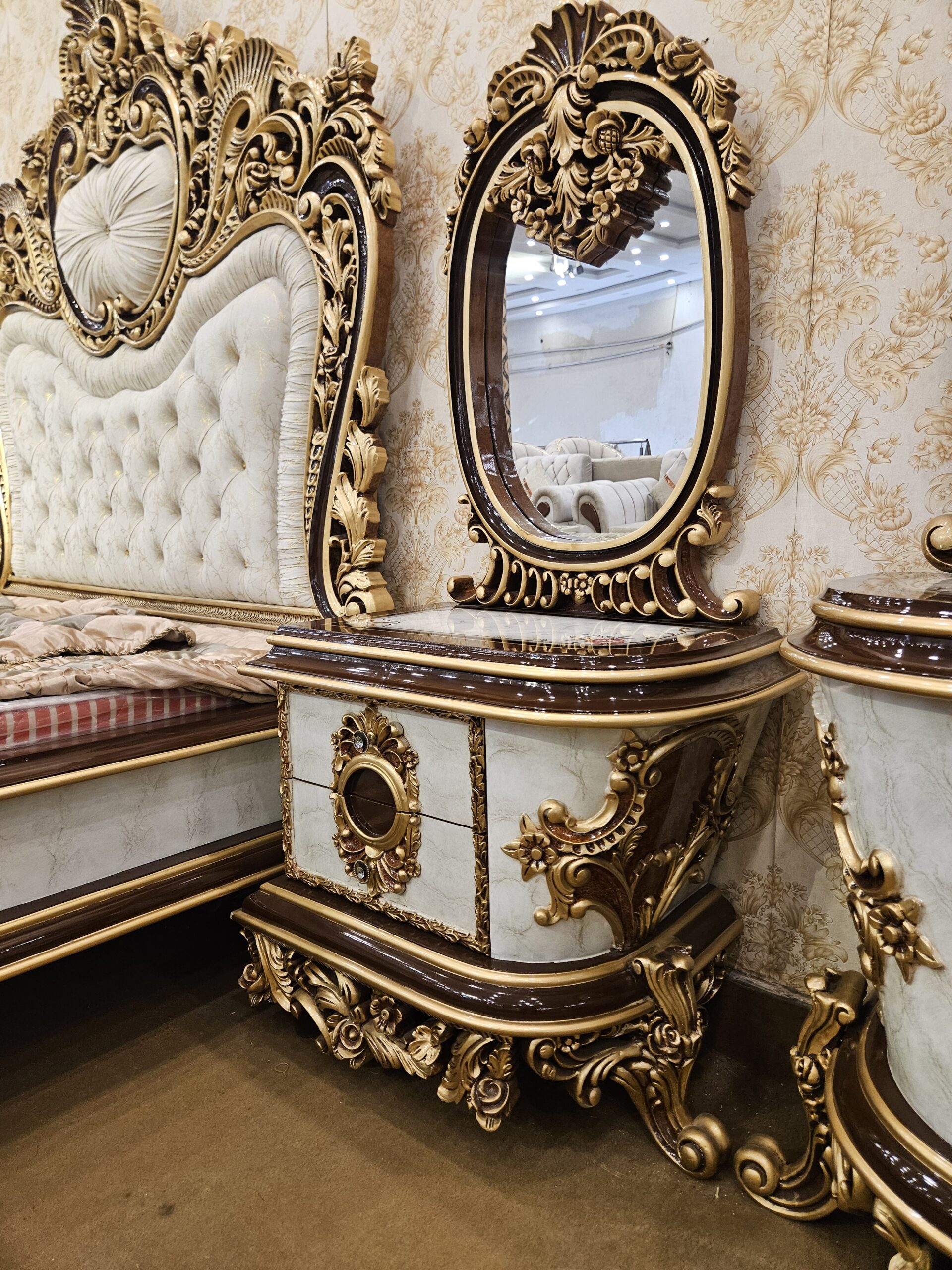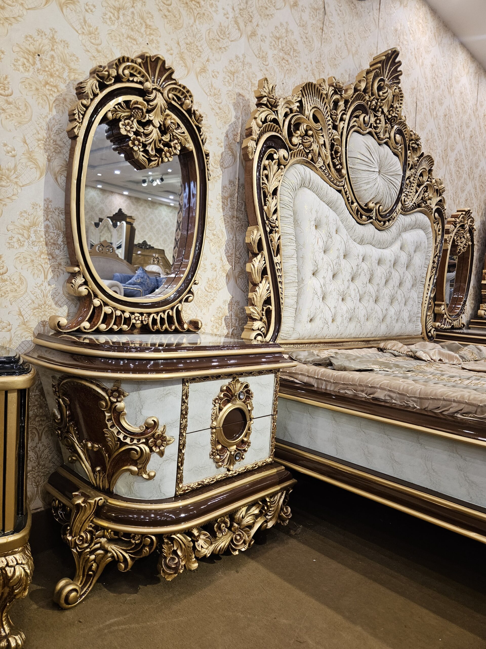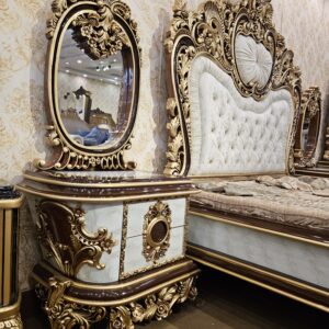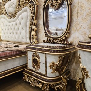 The Apple Royal Luxury Bed Set is designed for those who appreciate timeless beauty and royal craftsmanship. Built with a strong solid wood structure, this bed set showcases intricate gold detailing and a luxuriously tufted headboard that adds depth, comfort, and class to your bedroom.